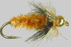 1: Slide the bead on the hook shank first. 2: Wrap a thread base the full length of the hook shank. 3: Wrap lead weight just behind the bead head and secure with thread. 4: Form a dubbing loop and wrap the body up to the bead head. Tie off and trim. 5: Tie in hackle and wrap 2 wraps of dark then 2 wraps of light and tie off. 6: Whip finish behind the bead head. |