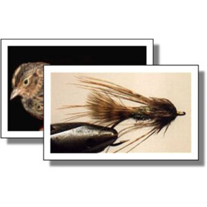 The Sparrow is very simple to tie but has one challenge: the aftershaft (philoplume) feather. You will soon discover its tip is quite fragile and difficult to wind without breaking off. The best suggestion seems to be a combination of the right hackle pliers, and a soft touch. Try breaking off the fragile tip before starting, then use hackle pliers with cushioned jaws or use an electronics test clip to grab the stem. Just wind it on, don’t worry about folding, tie it off, wet your fingers, pull the fibers back and tie back on them slightly while forming the head.