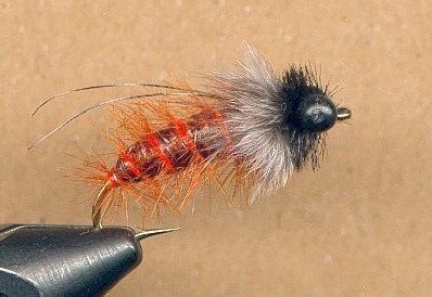 Use of a thread base under the lead wire is essential. Most of the body is attached to the lead wire and the body will turn easily around the hook shank if the lead is not secured properly. The thread adds traction to the wire shank and provides a porous surface for adherence of the cement or glue. Because the real bug is good sized, be sure to dub the body firm and generous. Use the brown marker heavily on the topside of the body. More orange on the bottom will give a more natural look.