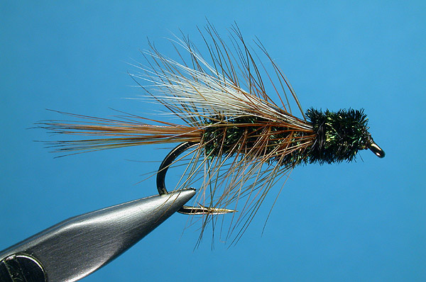 The method of palmering the hackle to the rear and using the rib to reinforce that hackle is a technique used in many wet fly patterns. The fragile herl body also benefits from the wire rib which adds extra segmentation. Note that the wing is tied on top of the body and not in front. This is vital to keep the wing at a low angle over the body in true wet fly fashion. For steelhead tie the pattern sparse on a steelhead hook. For a streamer style use a 4X long hook.