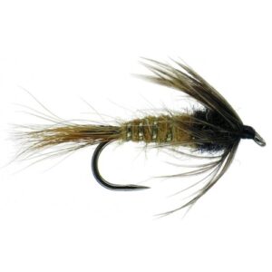 Step 8: Tie in the soft hackle feather and make 2-3 wraps forward creating the legs. Tie off and trim. Form a neat tapered head, whip finish and cement.