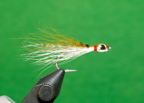 Body material is optional but adds the glow through the belly and wing materials suggesting the translucent nature of small baitfish. Holographic and braided Mylar are excellent choices to create this affect. The narrow thread collar gives the hint of the gill slit. The bulging eyes are a prominent feature on most superior baitfish patterns.